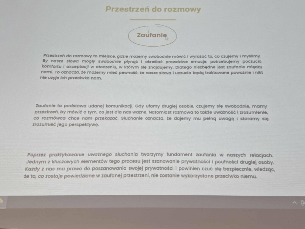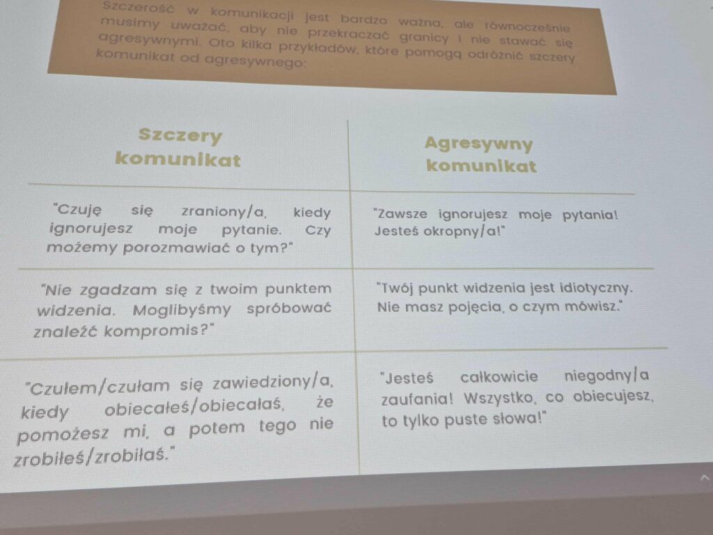 Uczniowie zapoznali się z rodzajami i technikami komunikacyjnymi. Nauczyli się, w jaki sposób akceptować emocje rozmówcy i komunikować o swoich potrzebach i emocjach. W drugiej części warsztatów uczniowie mieli okazję wypróbować poznane techniki komunikacyjne w praktyce podczas pedagogicznych gier zespołowych.
