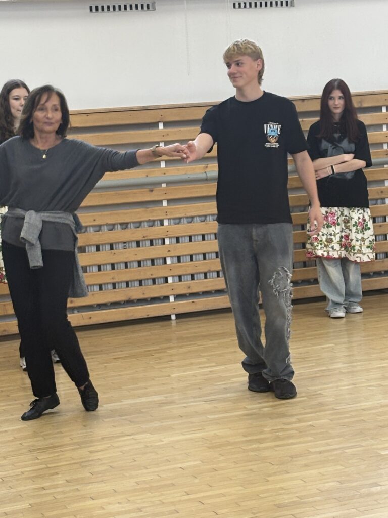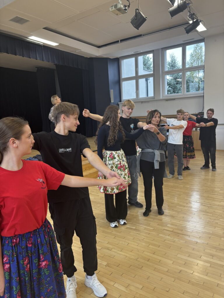 Działo się wiele. Zaproszono nas do sali baletowej siedziby zespołu i już po chwili zostaliśmy porwani przez cudowne Panie i Dziewczęta z zespołu, w wir krakowiaka – tańca ludowego.